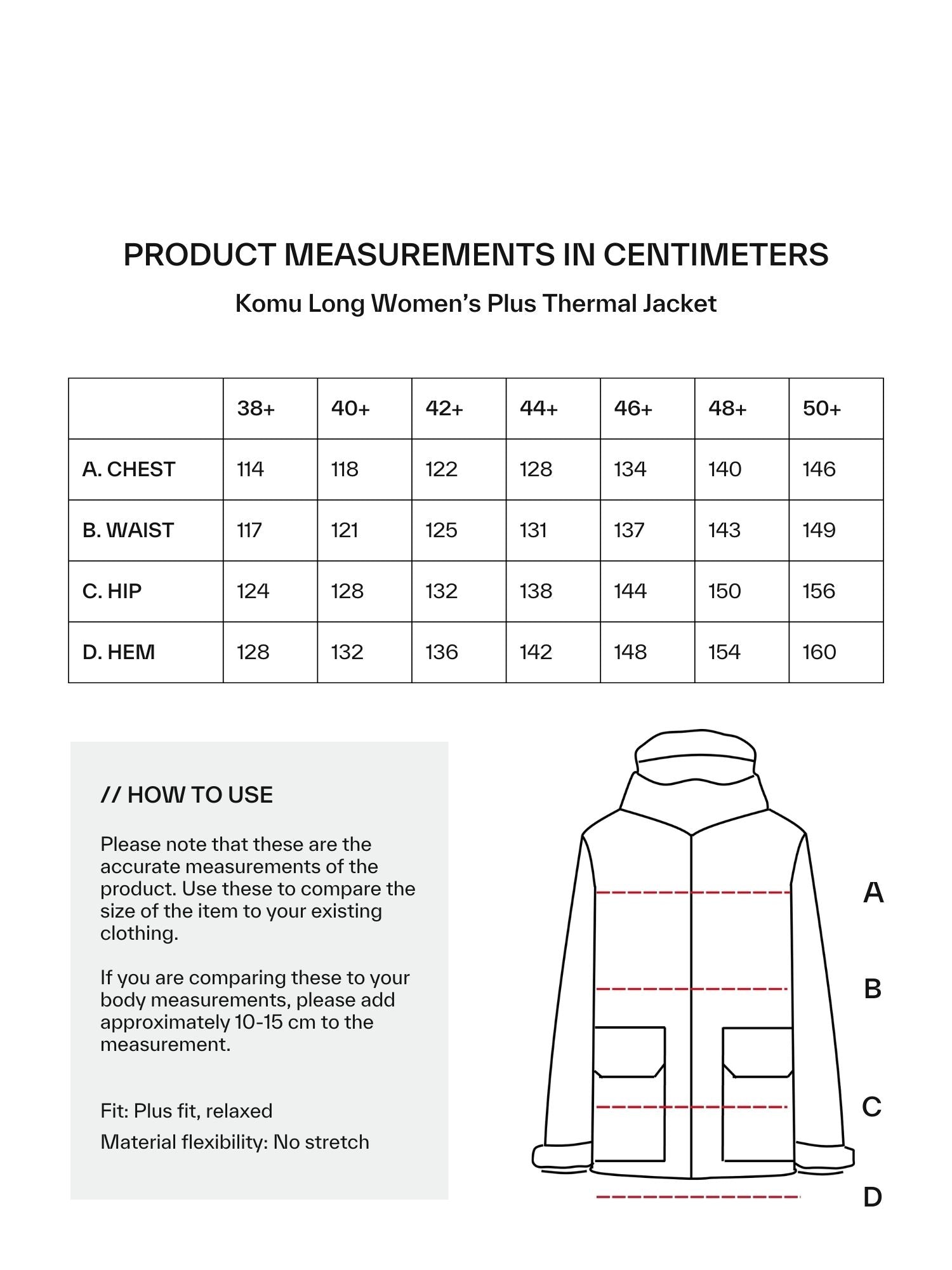 Komu Parkan är generös i storlek. Om du är osäker mellan två storlekar rekommenderar vi att välja den mindre för en mer åtsittande passform.