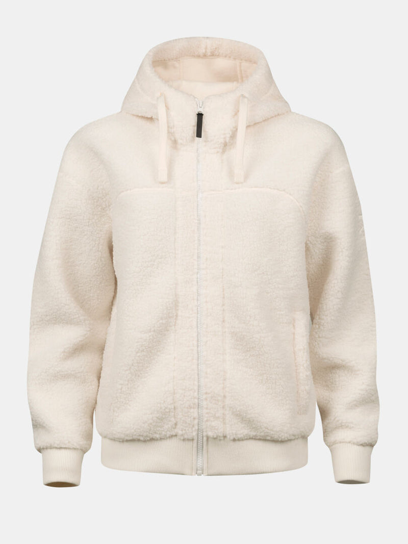 Halti Lykky Fleecejacka Dam är en cremefärgad sherpahuvtröja med dragkedja, fickor, huva med dragsko och ribbade muddar i ärmsluten.