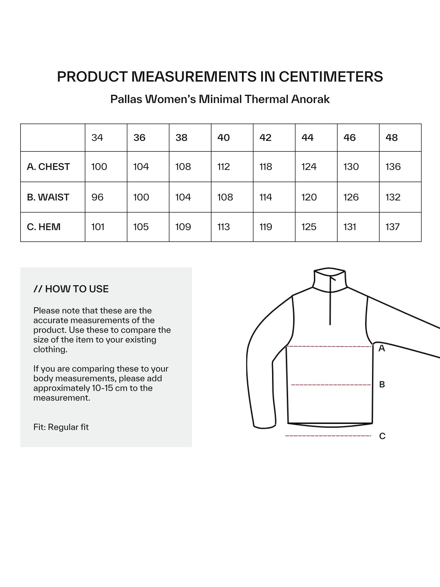 Välj rätt storlek: Pallas Minimal Anoraken motsvarar standard storlek och vi rekommenderar att du väljer samma storlek som du vanligen väljer på jackor. Observera att jackan har ett fluffigt foder vilket gör den snäppet stramare vid midjan. Använd vår storlkesguide om du är osäker på din storlek.