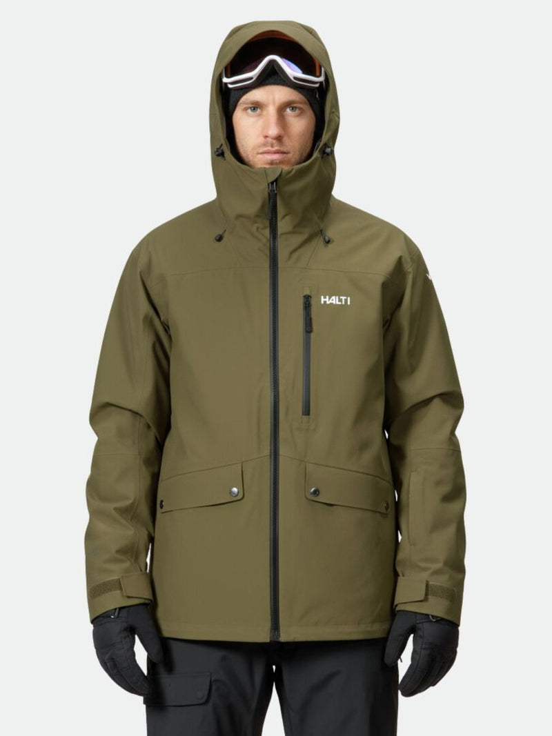 Halti Settler 3L DX Skidjacka Herr i olivgrönt med DrymaxX Nano, dragkedja fram, fickor med lock och logotyp på bröstet.