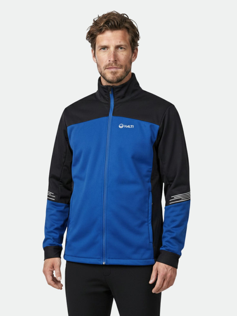 Siide Längdskiddräkt Herr från Halti: en blå och svart Stormwall® zip-up jacka med långa ärmar och hög krage.