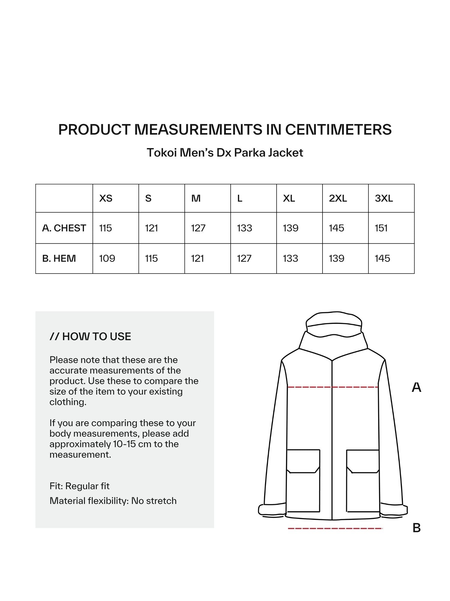 Tokoi Parkan har en normal passform. Vi rekommenderar att välja den storlek du vanligen använder för jackor.