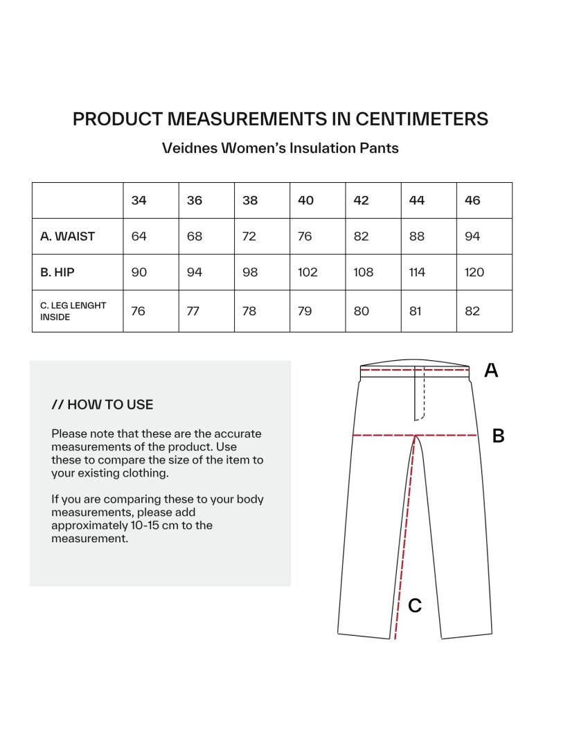Varma och mångsidiga dambyxor, som kombinerar ett tekniskt och flexibelt material med vadderade paneler. Veidnes fodrade byxorna kan användas som så eller som värmande mellanlager beroende på väderlek. Byxorna lämpar sig också vintertid för löpturer.